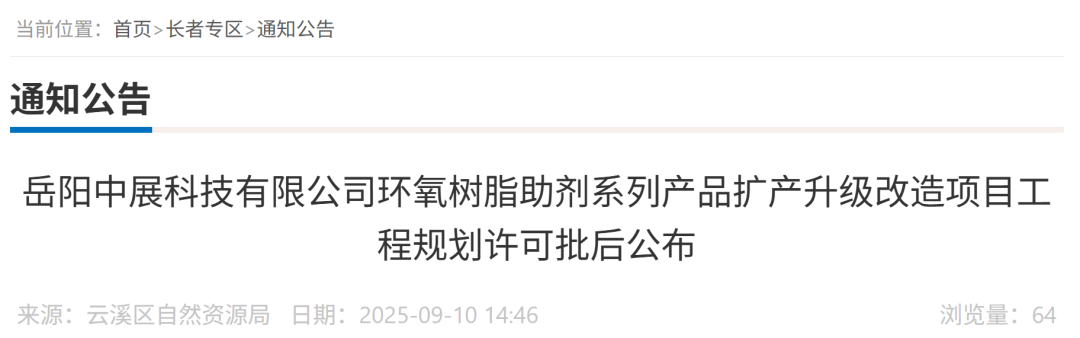 近日,云溪區(qū)自然資源局對岳陽中展科技有限公司"環(huán)氧樹脂助劑系列產(chǎn)品擴(kuò)產(chǎn)升級改造項目"工程規(guī)劃許可進(jìn)行公布。